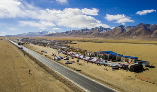 这是在青藏公路旁搭建的那曲县香茂乡畜产品展销会(2017年11月25日摄,无人机照片)。新华社记者刘东君摄