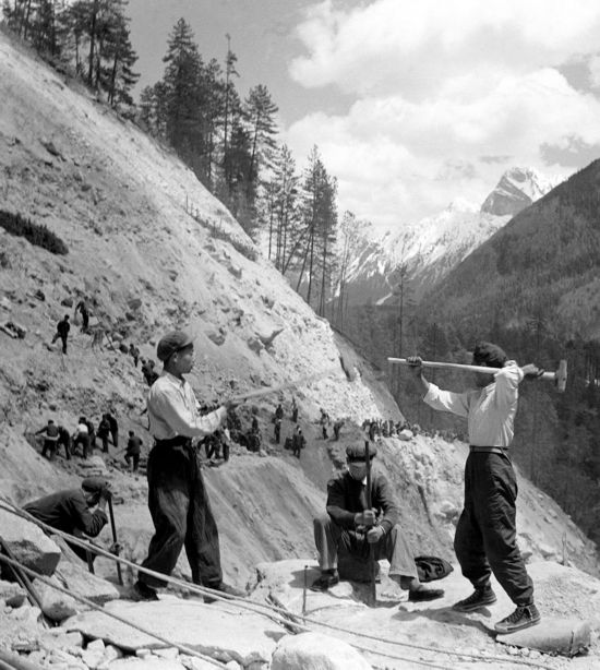 这是1954年筑路大军修筑康藏公路(1955年改名为川藏公路)的资料照片。新华社发